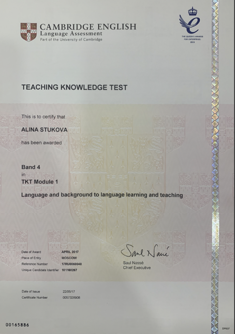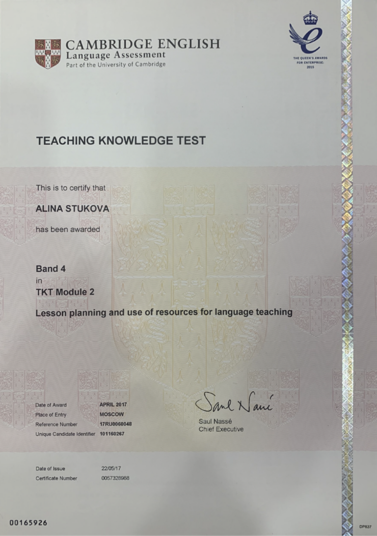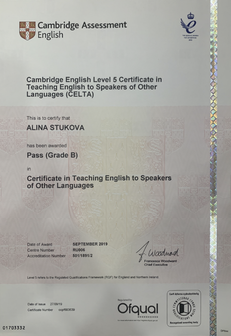 Ряд признанных Кэмбриджем сертификатов (CELTA, CAE (C1), и другие)