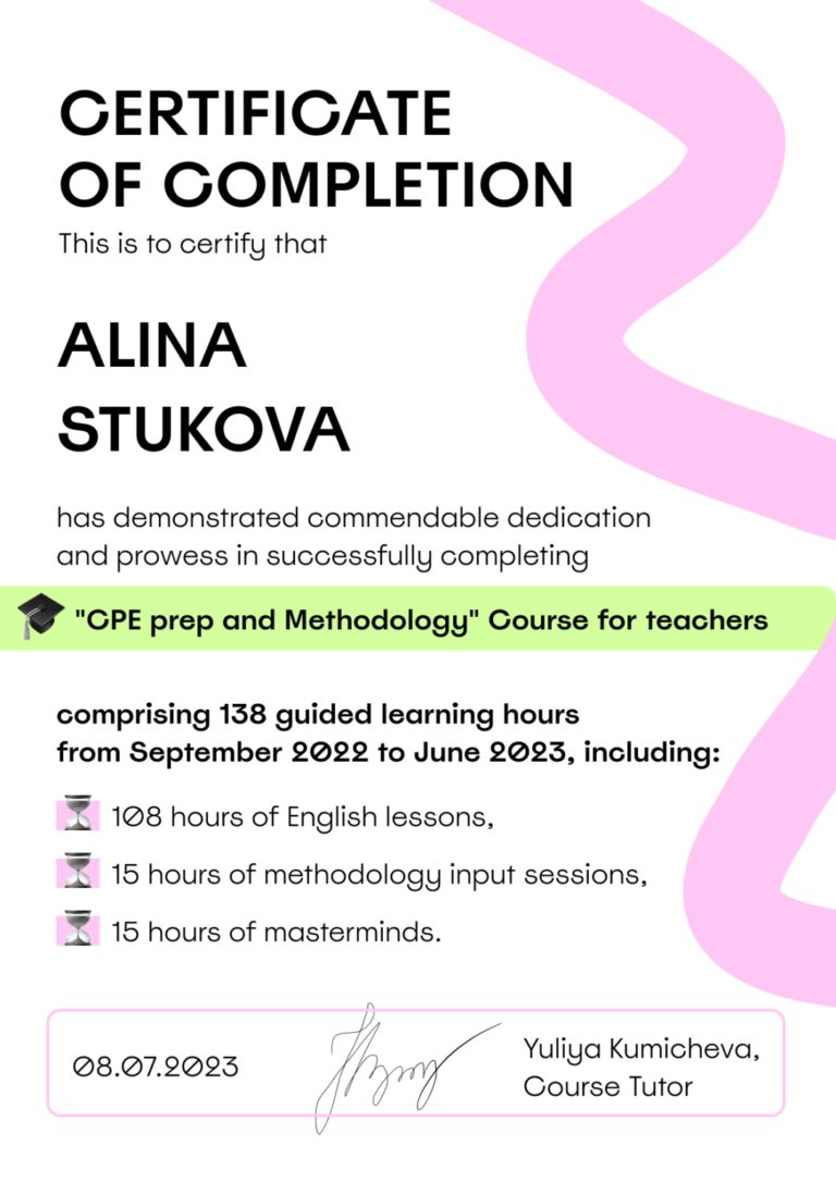 Практический опыт: С 2017 года я помогла множеству студентов добиться своих целей в изучении английского языка, включая успешную подготовку к различным экзаменам. Моя сильная сторона – быстро выявлять проблемные области и помогать их решать с помощью персонализированных активностей.